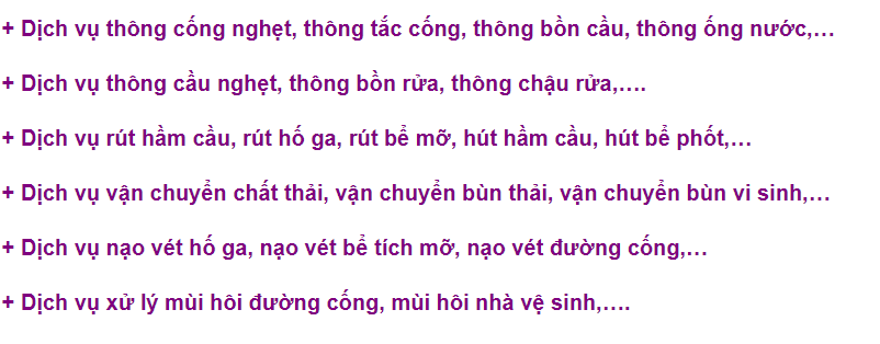 Công ty chúng tôi, luôn sẵnsàng phục vụ hút hầm cầu Bến Tre nhanh gọn và sạch sẽ, đảm bảo không tạo ra bất kỳ mùi hôi khó chịu nào. Bởi vì, trong quá trình thi công nhân viên công ty chúng tôi sẽ không đục phá. Do đó quý khách hàng có thể hoàn toàn yên chí khi lựa chọn sử dụng dịch vụ rút hầm cầu Bến Tre của công ty 24h chúng tôi cung cấp. Hiện nay trên địa Bàn Bến Tre chúng tôi còn triển khai thêm nhiều các dịch vụ khác như thông tắc bồn cầu giá rẻ, hút chất thải,…, những dịch vụ đó bao gồm bên dưới đây.
